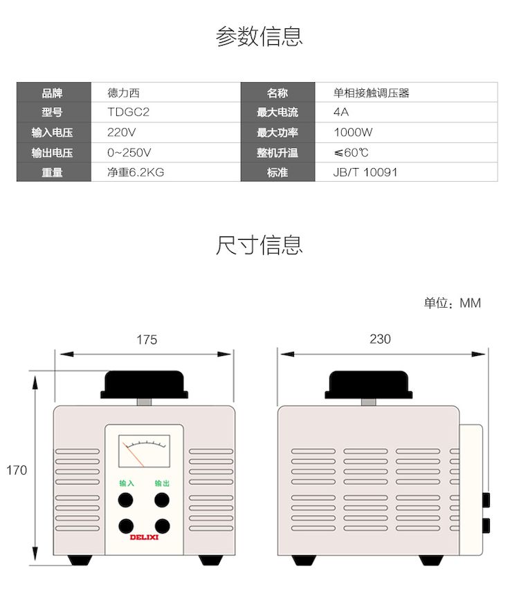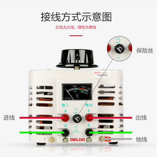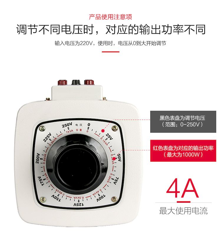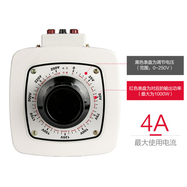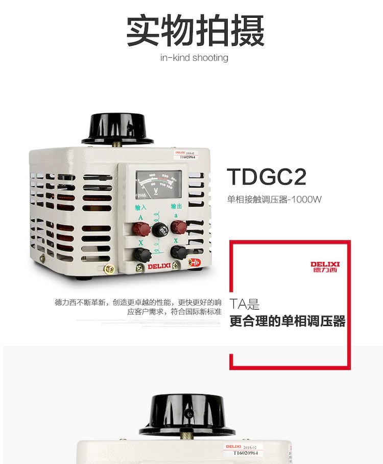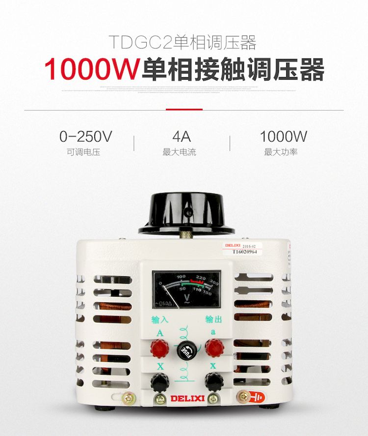 德力西單相調(diào)壓器 TDGC2-1KW/1KVA/1000W 輸入電壓220V 可調(diào)電壓0-250V 最大電流4A |